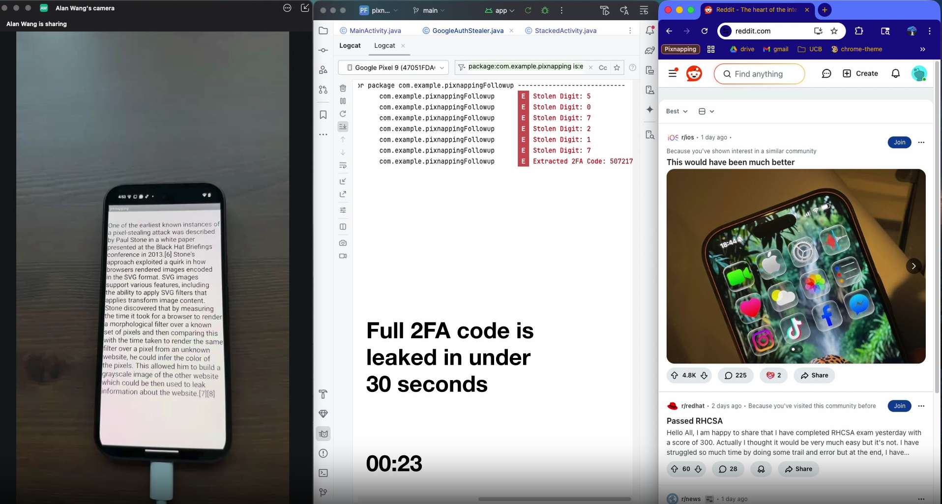 Pixnapping، در هسته خود، یک چارچوب سرقت پیکسل است که دستگاههای اندرویدی را بهگونهای هدف قرار میدهد که از راهکارهای مقابله با مرورگر عبور میکند و حتی با بهرهگیری از APIهای اندروید و یک کانال جانبی سختافزاری، دادهها را از برنامههای غیر مرورگر مانند Google Authenticator استخراج میکند و به یک برنامه مخرب اجازه میدهد تا از این تکنیک برای گرفتن کدهای ۲FA در کمتر از ۳۰ ثانیه استفاده کند.